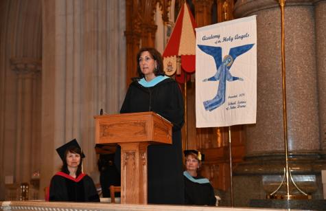 “Angels now. Angels always,” Failla began, immediately capturing her audience. Failla pointed out that AHA families choose the Academy because they understand that their daughters ask different questions about themselves and the world. The all-girl setting allows students to focus on themselves and develop confidence. She spoke about facing gender and age-related biases, and advised the Angels to rely on the strength and confidence they have built at AHA to surmount similar obstacles.