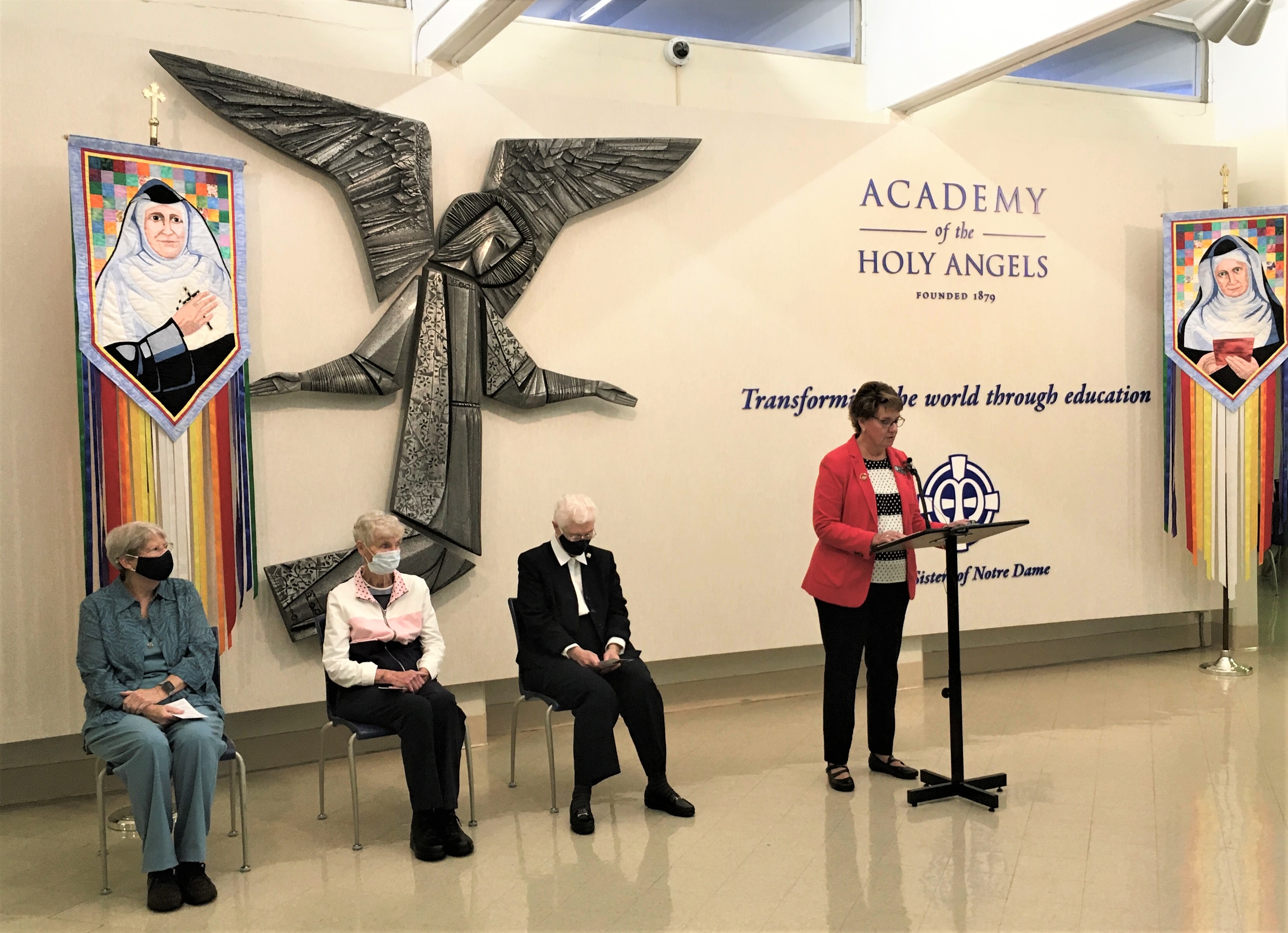 “Let’s trust one another, rely on each other, believing our world can be healed and be a better place,” Hanlon said. “Let us all seek the love, faith, and hope that Blessed Theresa knew, and together let us honor all the SSNDs who have served us at Holy Angels and wish them many blessings on this day.”