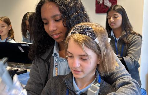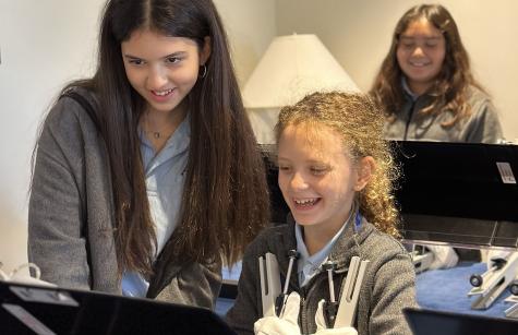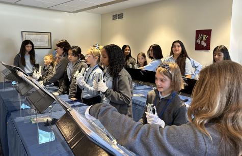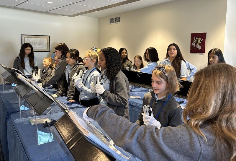 First-year handbell ringers from the Academy of the Holy Angels Middle School are receiving expert tips and hands-on assistance from experienced eighth graders. The sixth graders clearly enjoy getting one-to-one assistance from the older Angels as they learn to play the bells and chimes.