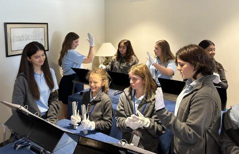 AHA Performing Arts Director Daniel Mahoney gives the eighth grade girls a ringing endorsement, especially for working to build the middle school’s handbell “team.”