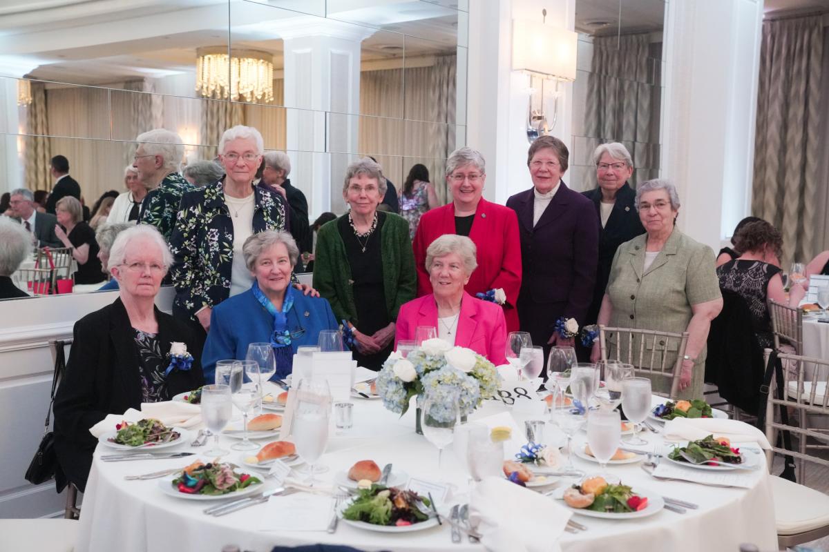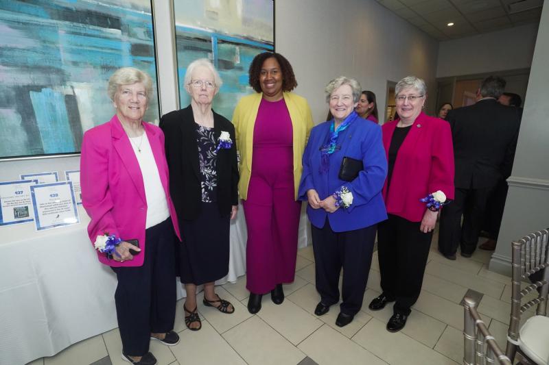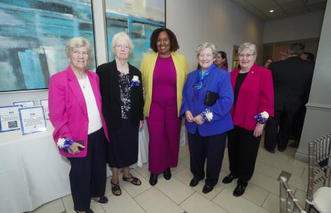 SSNDs in attendance included S. Kathleen Dunham, retired full-time faculty member and active substitute teacher; S. Patricia Murphy, president emeritus; S. Maria Iannuccillo; S. Mary Roy Weiss, trustee; S. Mary Foley, retired school social worker and current director of auditorium services; S. John Vianney; S. Eileen Reilly, trustee; S. Mary Maher (AHA '68), trustee; and S. Sharon Slear, former trustee.