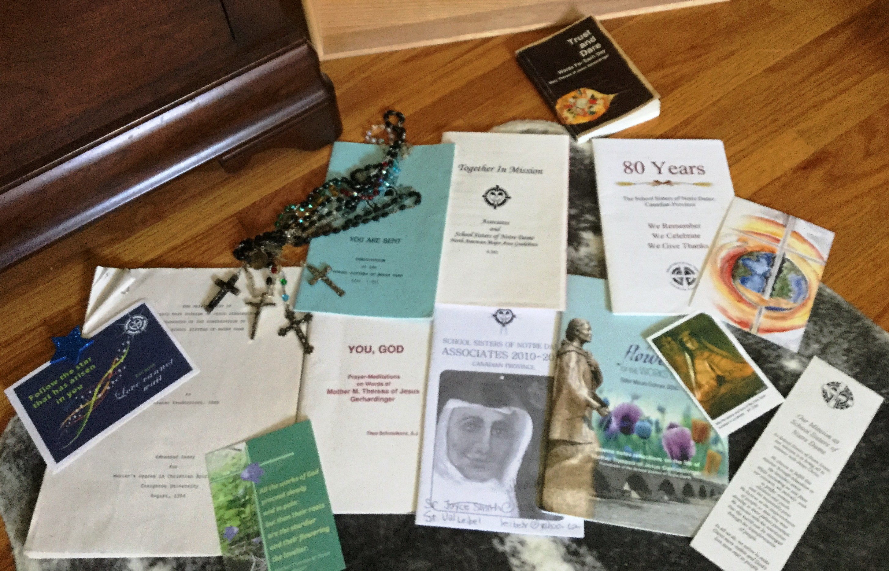 I researched and discovered that the Congregation of Notre Dame had an associateship program. I wrote to them and they responded with a relic of Saint Margureite and the news that their closest Sister was more than 1,000 miles away. (In retrospect, it is interesting that this search for “my saint” was taking place while I was receiving Spiritual Direction from Sister Harriet, and never once had I bothered to mention it to her). However, when my dream of associateship with the Congregation of Notre Dame was impeded by distance, I could not help but complain to Sister Harriet. She listened and then said that her Congregation, the School Sisters of Notre Dame, had an Associate Program that was just extending to Western Canada. I replied by telling her of the importance of my birthday…not just any saint would do!
