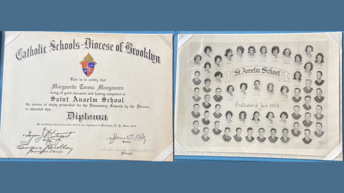 Hello to all at the School Sisters of Notre Dame. My name is Marguerite Manganaro Marett. I attended St. Anselm's from 1st to 8th grade. I was in the graduating class of 1964. My 8th grade teacher was Sister Margaret Mary Collins, formally Sister Constantia. She was an amazing teacher and a wonderful person. We stayed in touch until she passed away. I've attached a copy of my diploma and 8th grade graduation class.