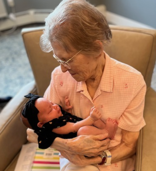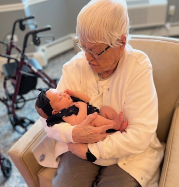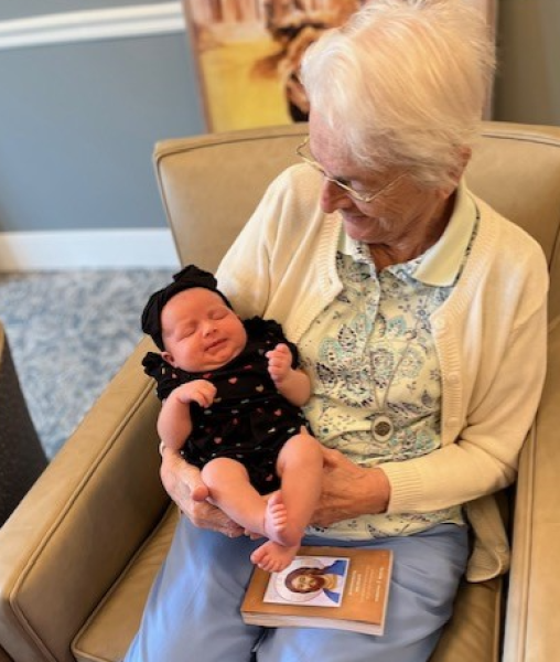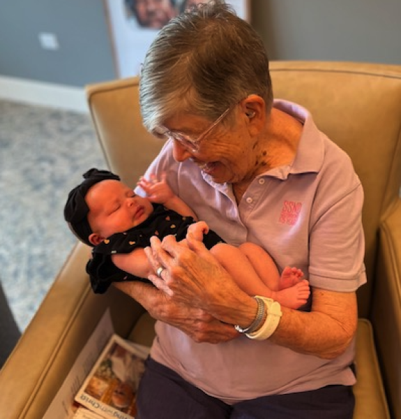 Marian Village SSND nurse, Lauren Cook, gave birth to a beautiful little girl recently. Lauren brought Noona to meet the Sisters at Marian Village in Homer Glen, IL, and many of them enjoyed holding her.