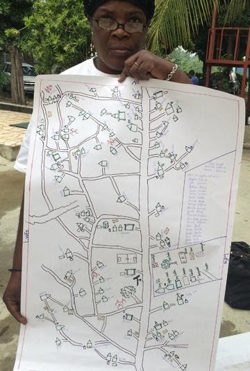 Currently, Freda leads groups through a process of social mapping, a low-cost tool that engages community members in preparing pictographic representations of their village. Key informants, including elected leaders and community members, create pictographic images of each neighborhood in their community — footpath by footpath and house by house. These maps include essential community assets, such as schools, well, churches, and markets. The image [below/at right/at left of Freda holding a map] illustrates one such map.