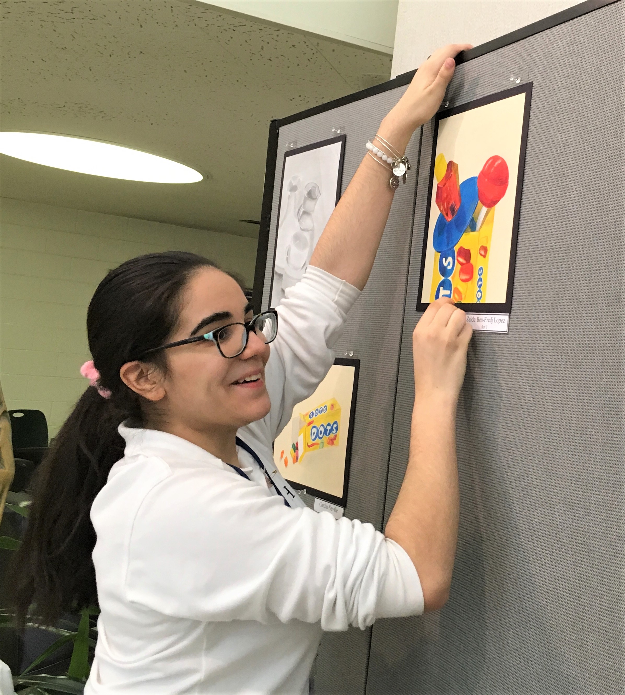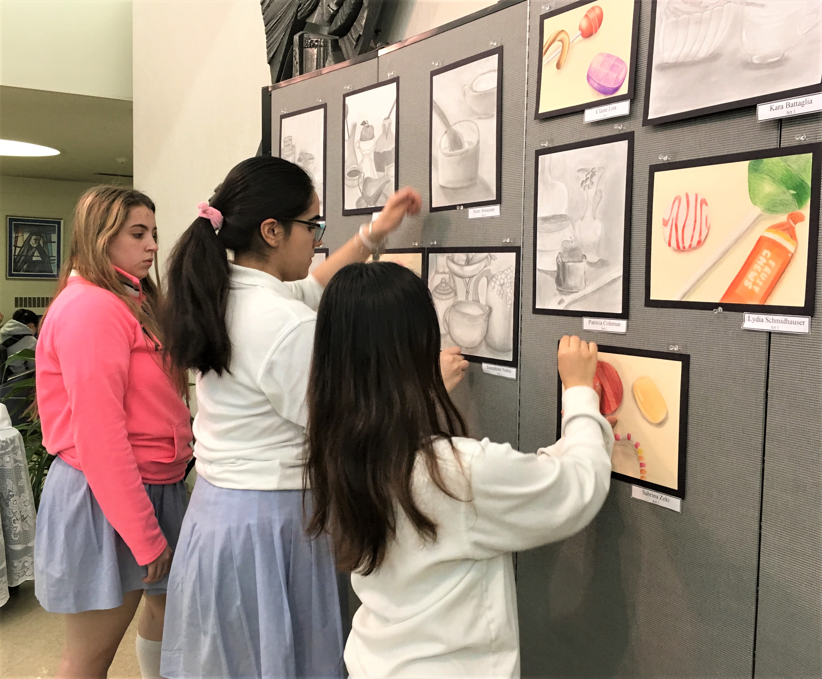 Art teacher Kathryn Biskup directed a handful of efficient student volunteers, who skillfully arranged the striking exhibit in just under 30 minutes. The motivated and artistic crew included Arielle Maravilla, Gianna Guido, Haram Kim, Cassandra Davila, and Gabriella Borges.