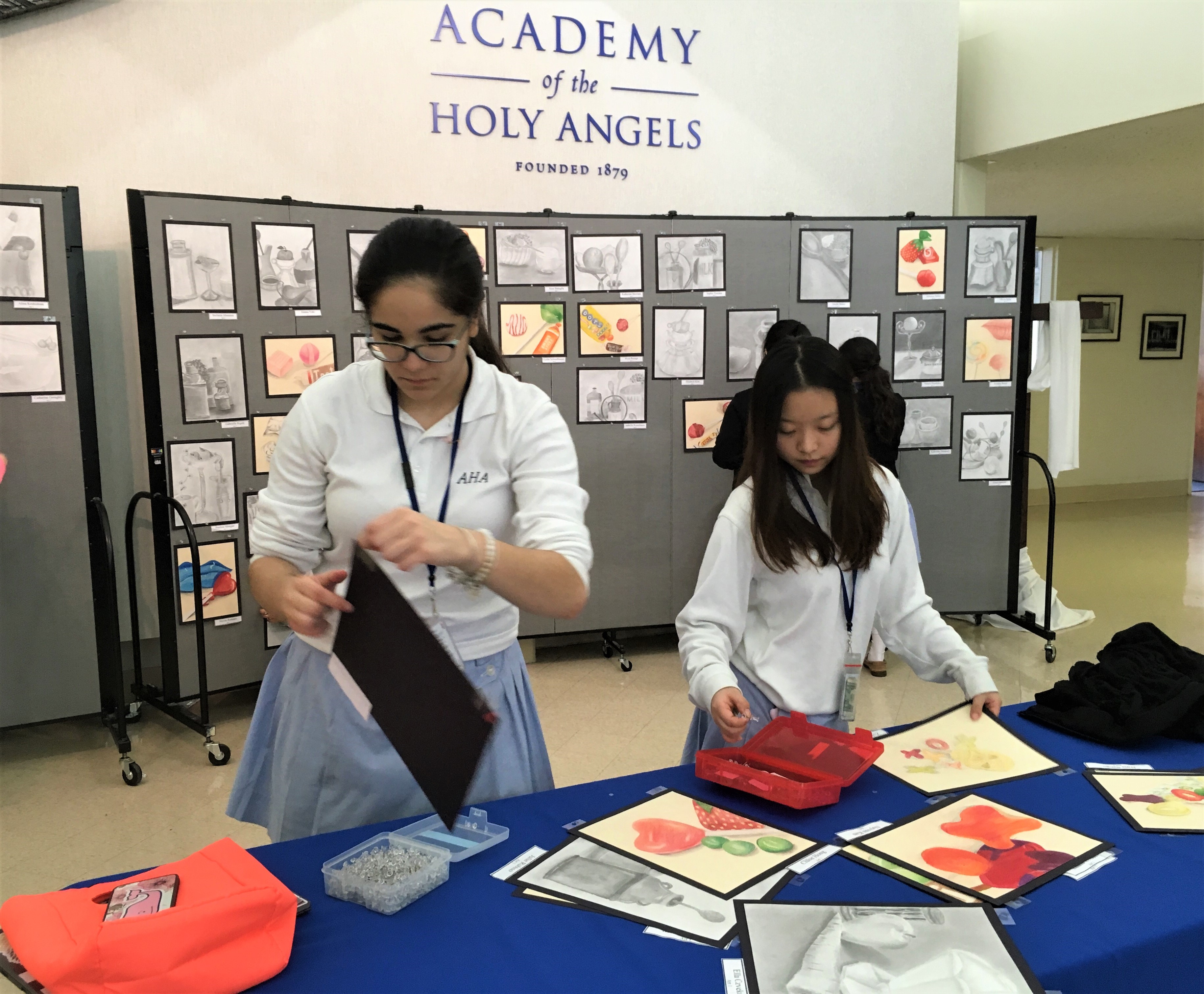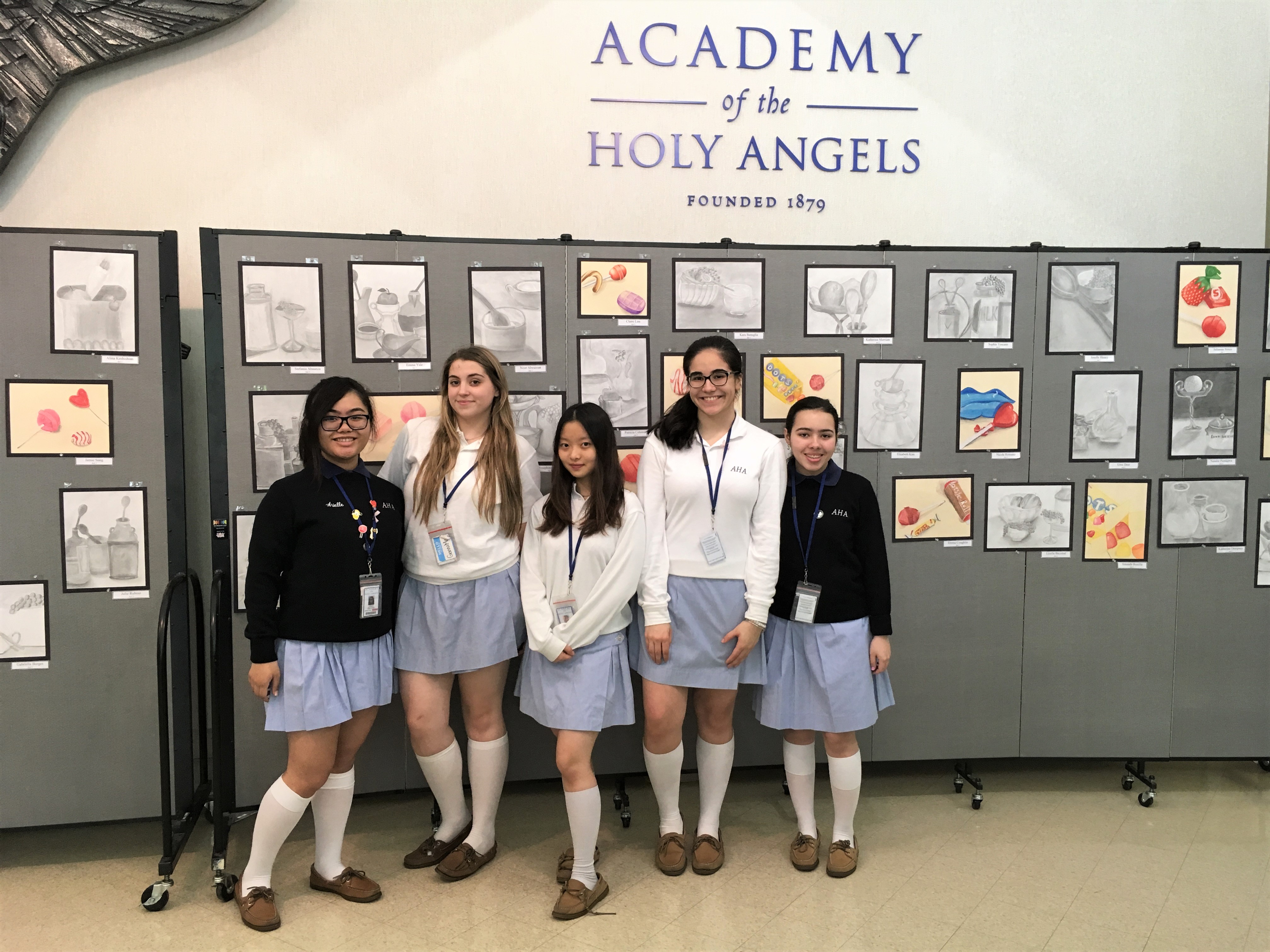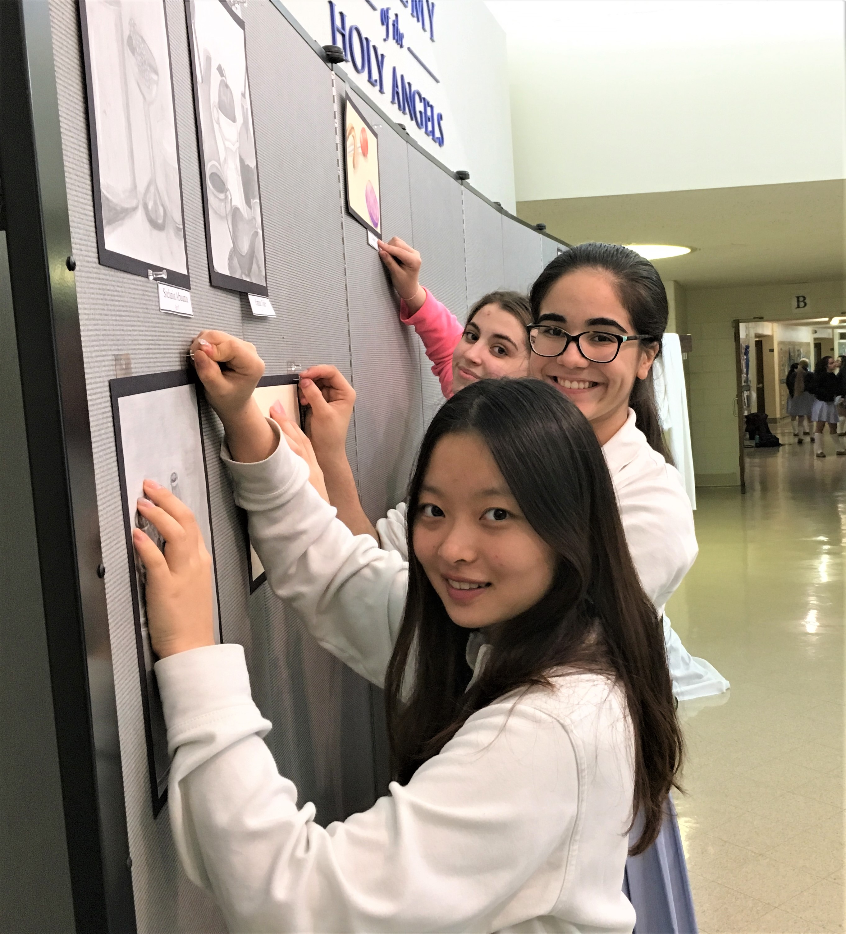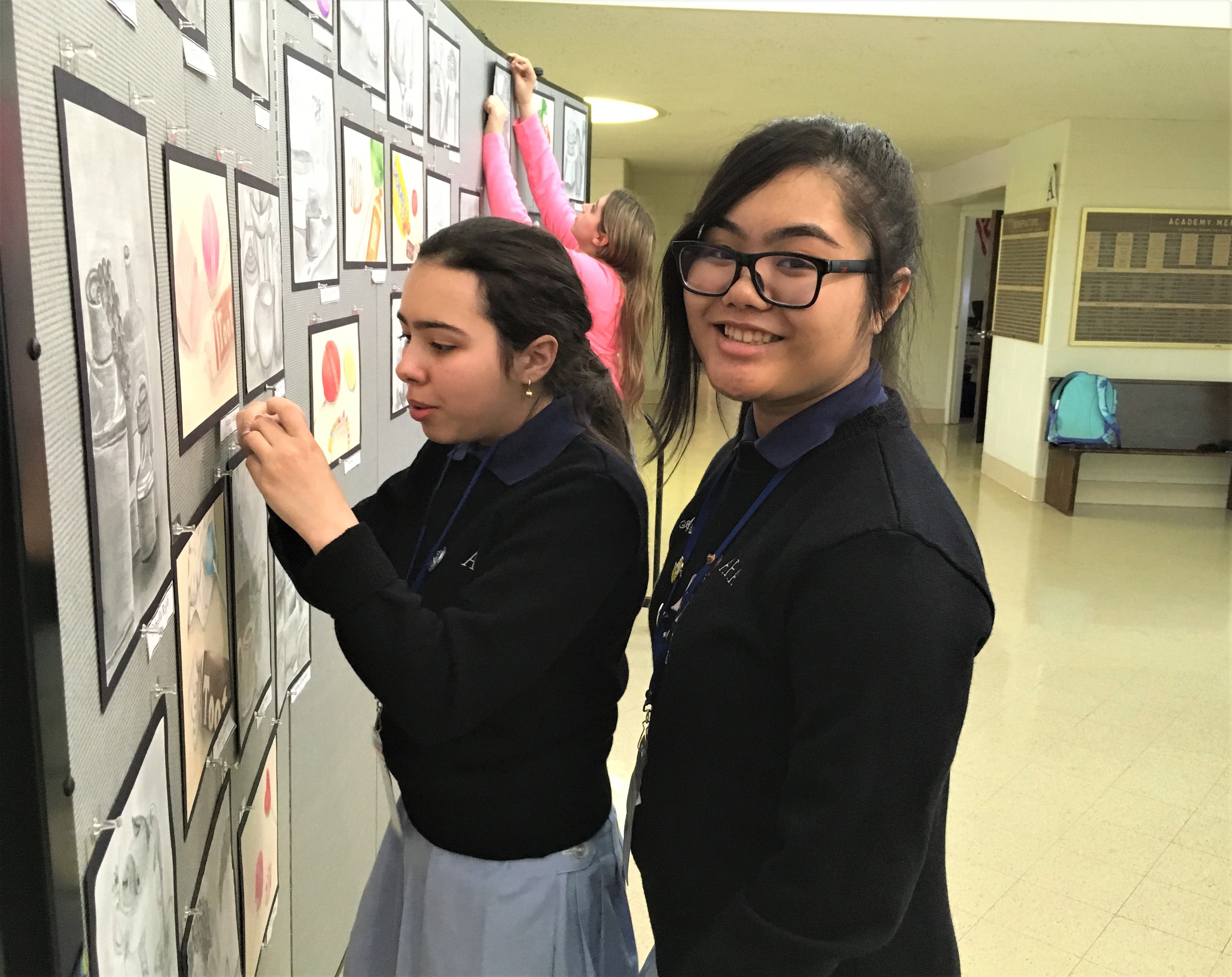 Black-and-white and color pencil drawings made by first-year art students at Academy of the Holy Angels are currently on display in the Academy’s main lobby.