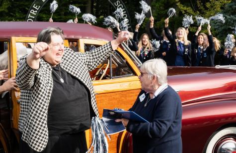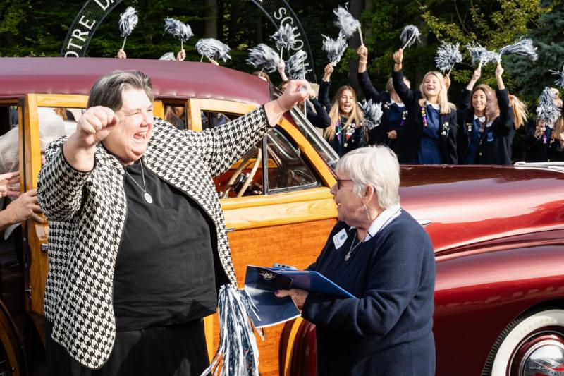 Charles Street Caravan: Leading a caravan of two Blazer minibuses along Charles Street was a vintage wood-paneled station wagon reminiscent of the vehicles parents used to help move library books, desks, and chairs to Hampton Lane when the school relocated in 1960. Riding in the wagon were Sister Patricia and Sister Charmaine. At NDP, the entire school community—cheering with pom poms in hand—greeted the caravan as it rode on to campus. Several media outlets were there to capture the arrival.