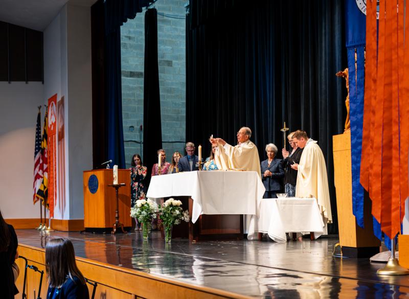 Anniversary Liturgy: After the caravan arrived on campus, the school community held the Anniversary Liturgy, over which Archbishop William E. Lori presided. Ceremonial SSND-created banners of Mother Theresa and Mother Caroline, as well as a specially created NDP banner, were used. During a gratitude procession, white roses were presented to recognize the present and past members of the various constituents that comprise the NDP school community. Communion mediation featured the world premiere of “Follow the Star,” a choral and string piece based on the writings of Blessed Theresa of Jesus which NDP alumna Leia Sofia Mendez ’19 composed for the Liturgy.
