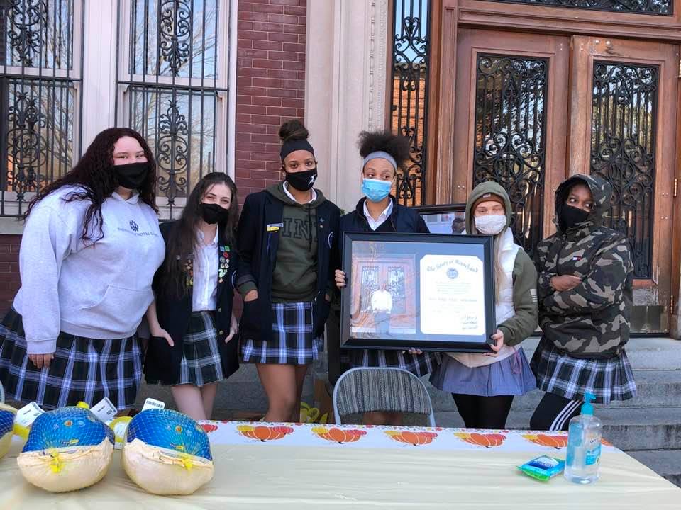 Local alumnae worked with the Baltimore Housing administrator for Latrobe to inform each family of the time to pick up their box over the following two days to assure social distancing. Each box had a turkey and all the trimmings, as well as dairy products such as eggs, butter, and cheese. Former IND students now at Notre Dame Prep decorated the boxes. Six former IND students from John Carroll High School came in their IND uniforms to earn service hours by assisting in the distribution.