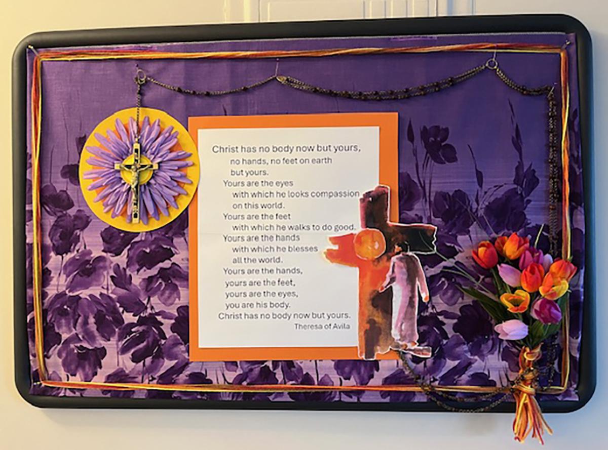 Creating the community bulletin board at The Watermark is a prayerful, artistic process for Sister Justine Nutz, SSND.