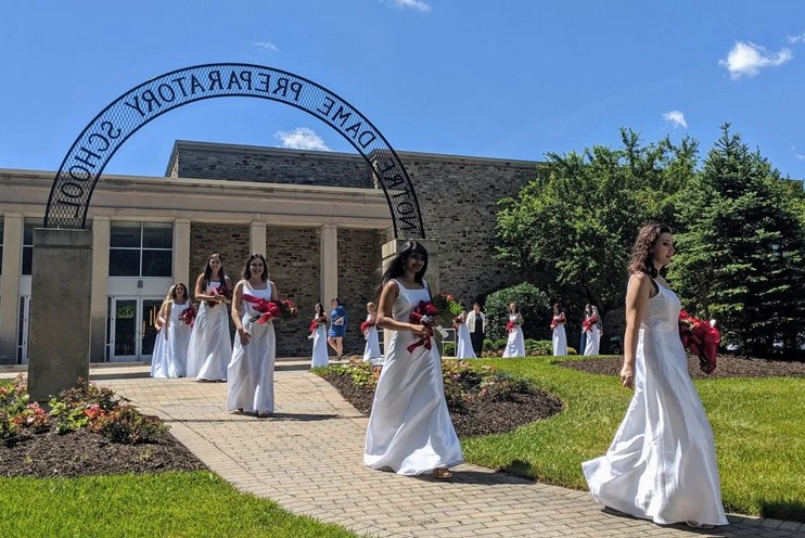 Notre Dame Preparatory School graduates have carried red roses and worn identical white dresses for more than 70 years. The graduation was originally scheduled for Wednesday, May 27, but was postponed due to COVID-19 restrictions.