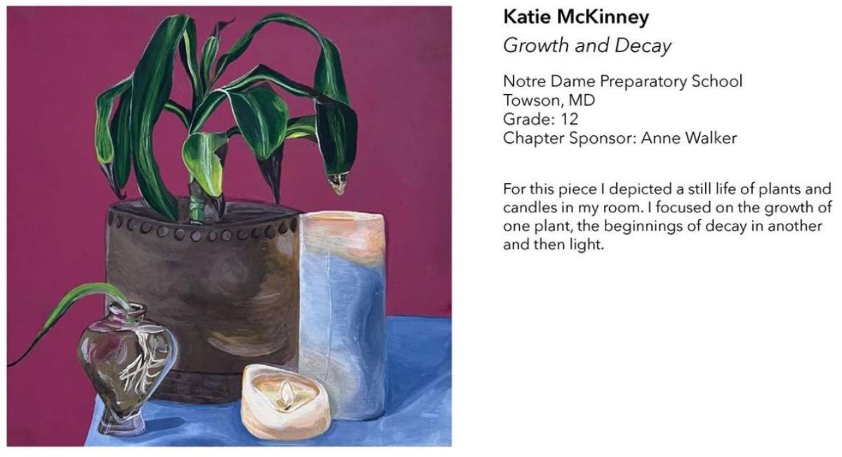 Artwork by Notre Dame Preparatory School senior Katie McKinney (Phoenix, MD 21131) has been selected for the eighth annual National Art Honor Society/National Junior Art Honor Society (NAHS/NJAHS) Juried Exhibition. McKinney’s painting, “Growth and Decay,” was selected among a record-breaking 2,410 submissions from schools throughout the world. Of the 127 artists highlighted, only five students hail from Maryland.