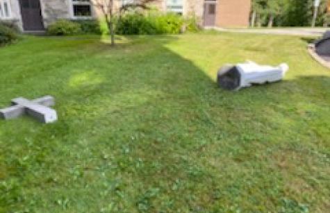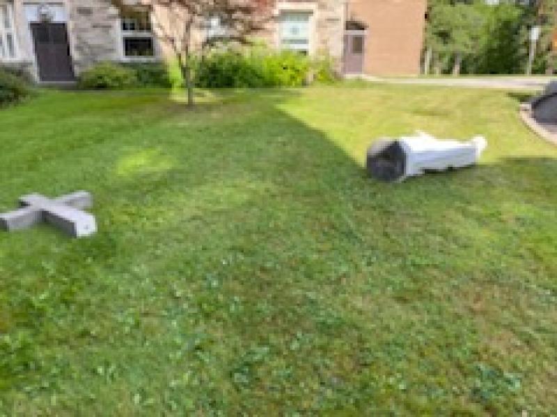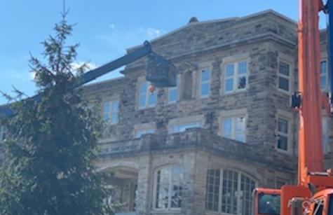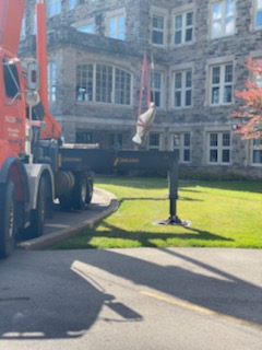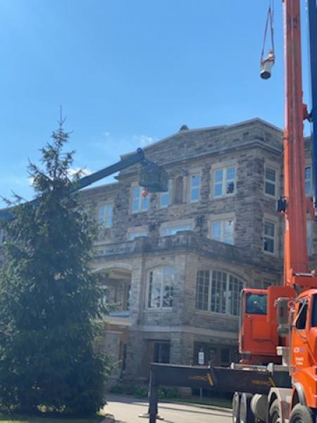 On the morning of July 12, the Sisters at Notre Dame Convent in Waterdown, Ontario Canada gathered in the chapel for a brief prayer in honor of our Blessed Mother Mary. The Sisters prayed the Memorare and sang the Salve Regina even as they heard the sounds of the crane arriving to move the statue of the Blessed Virgin Mary and the solid cement cross, which have held their place of honor high above the entrance of Notre Dame Convent for the past 95 years.