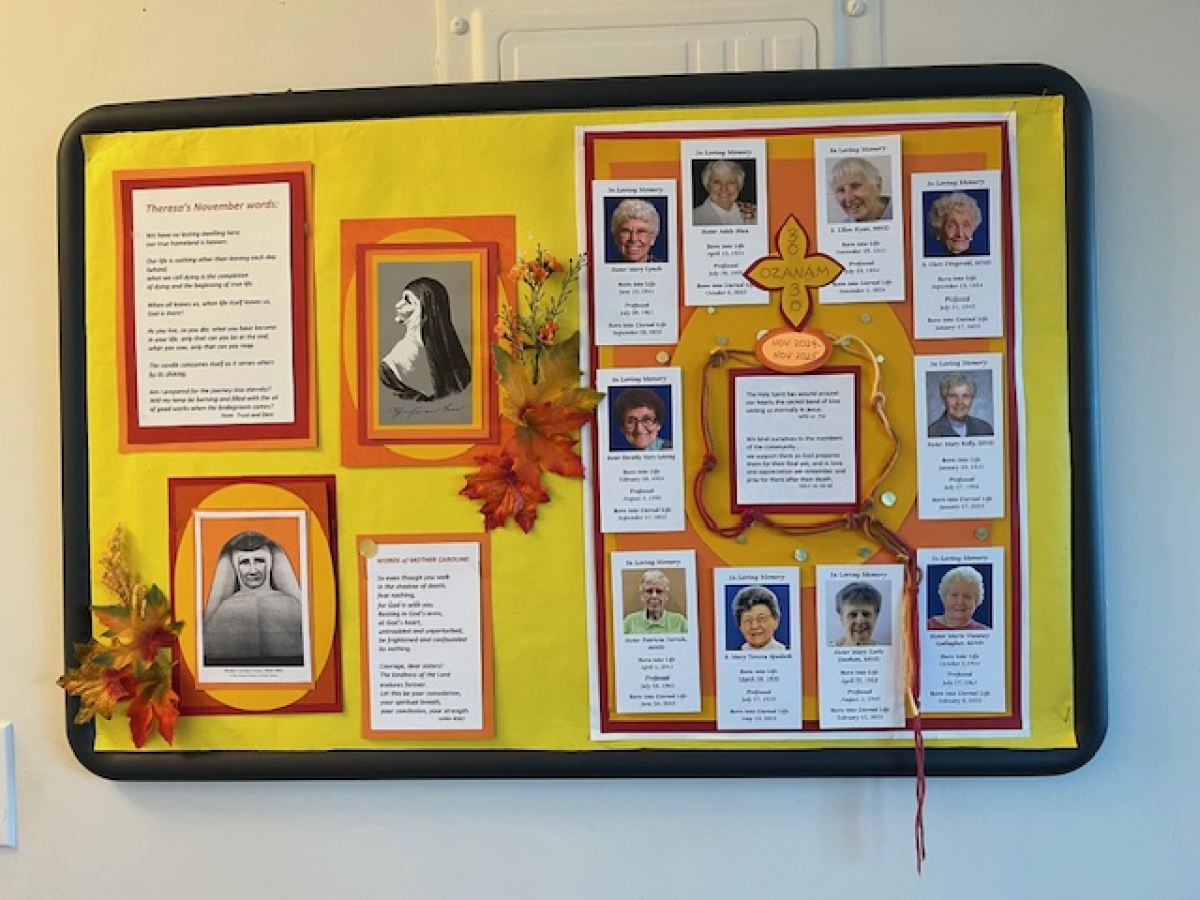 Pictures and words of Blessed Theresa and Mother Caroline grace our November bulletin board at 3030 Park.