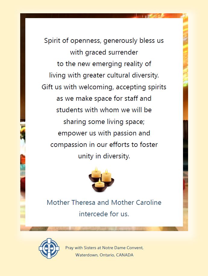 The press release below was sent out to announce the sale of our province's Notre Dame Convent in Waterdown, Ontario Canada. Throughout the sale process, our Sisters in Canada have been praying a special prayer as part of their transition process. You can find a copy of the prayer at the bottom of this page or by clicking here. Please add it to your prayer ritual as a show of support for the Sisters of NDC and those who care for, work with and love them.