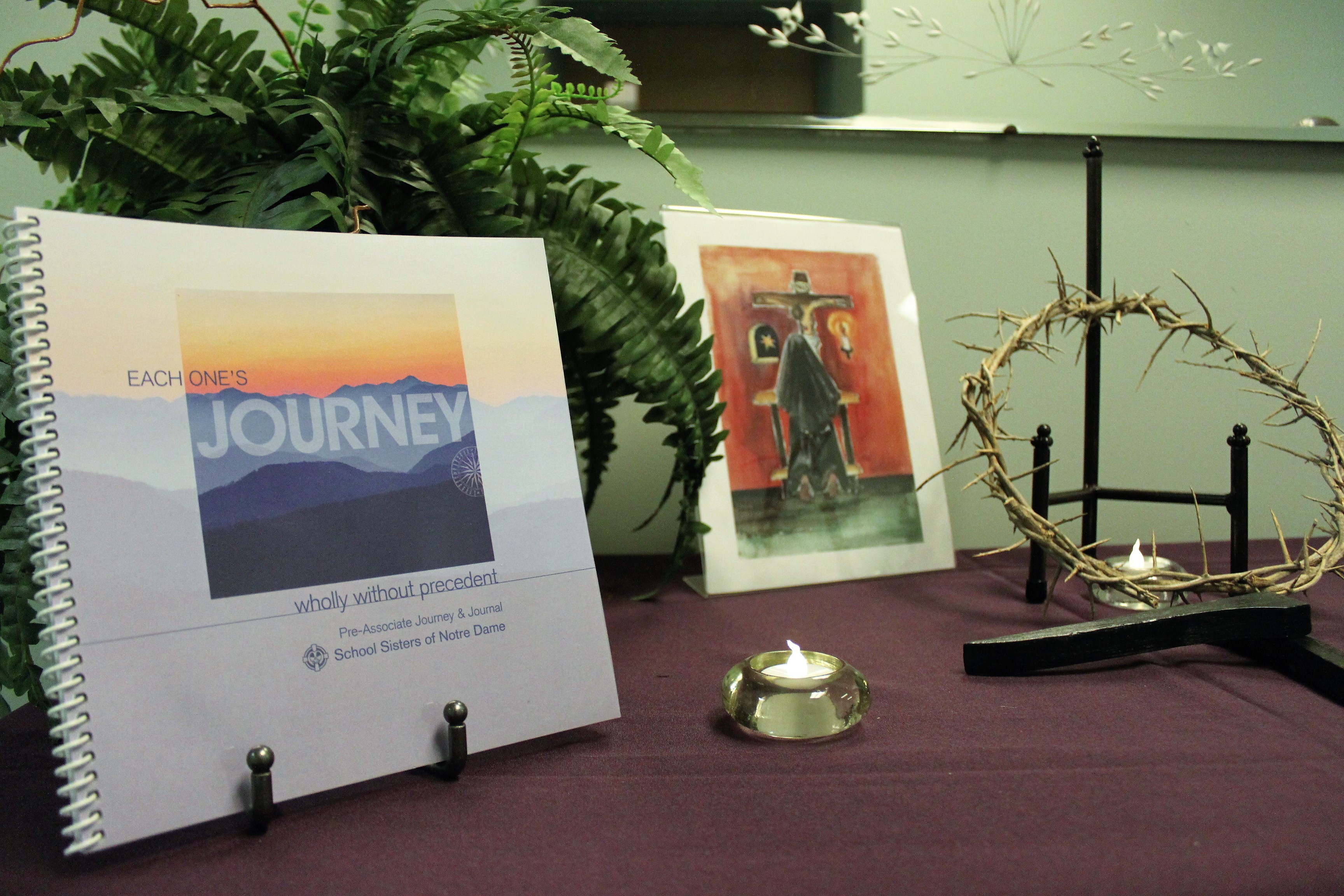 The pre-associate journal is showcased on the décor table in the council north wing in Baltimore to remind all who pass by that Lent for our SSND family is a journey into the heart of God, through deeper commitment to the spirituality, charism and ministry of the School Sisters of Notre Dame.