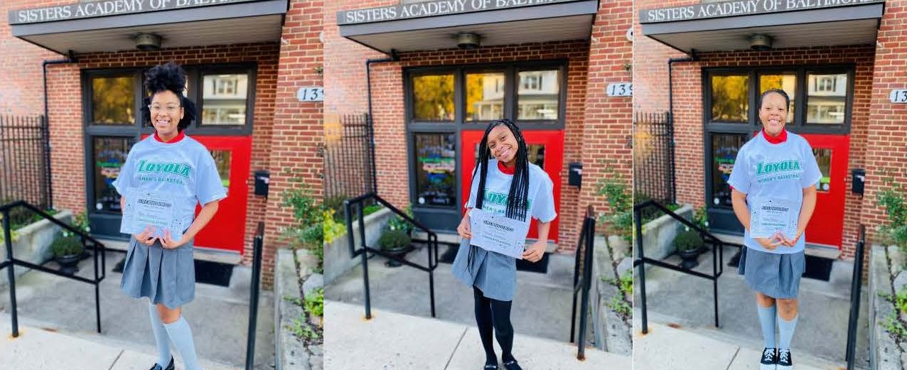Three students from Sisters Academy of Baltimore recently snagged the top three spots in a middle school essay contest at Loyola University in Baltimore. First place was Khali Howard; second place was Aaliyah Matthews; and third place was Dalon Hanks (pictured from right to left above). We congratulate them on this success!