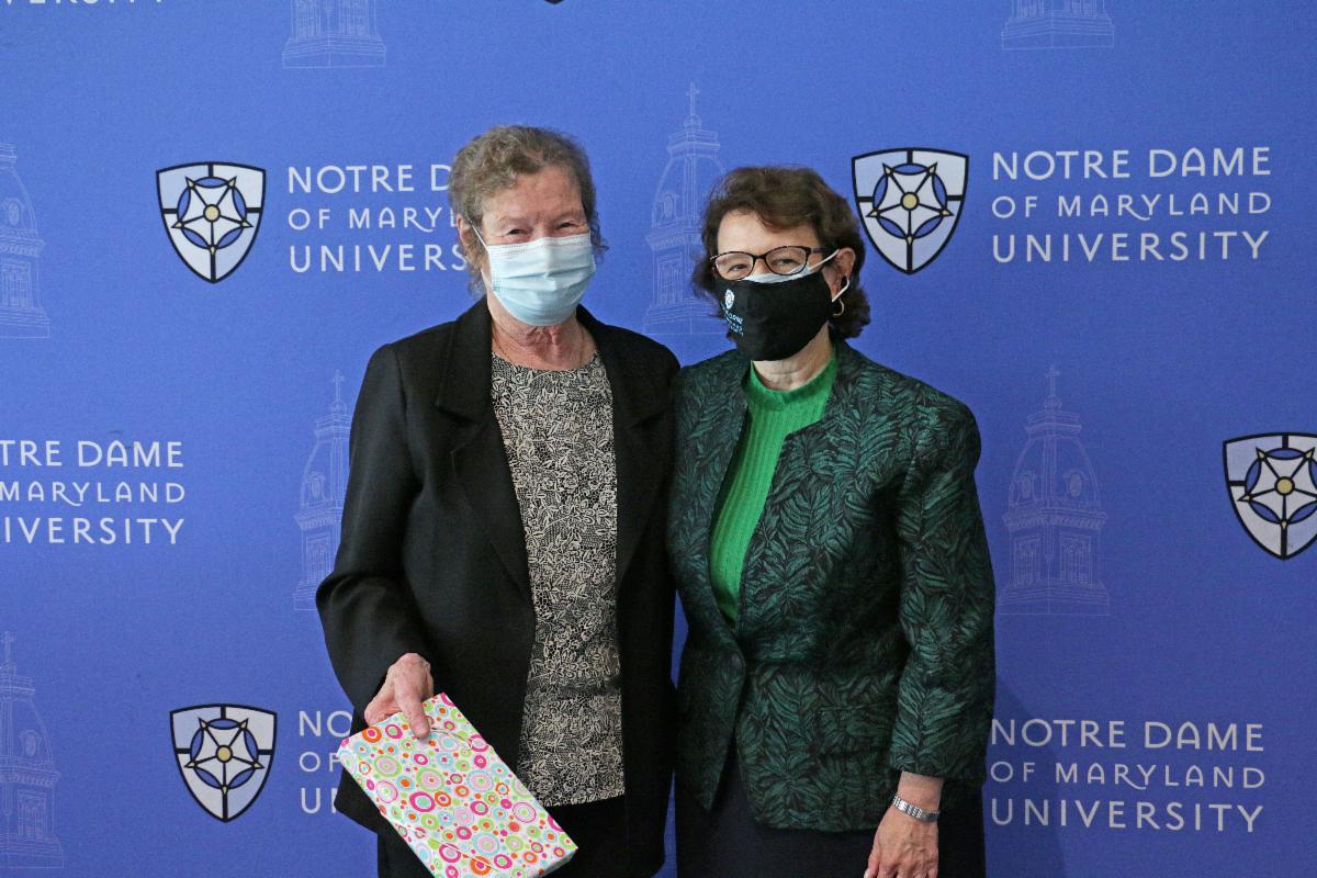 On May 25, Notre Dame of Maryland University honored Sister Margaret Ellen Mahoney, SSND (pictured near right), an English professor and former department chair, for her golden jubilee of 60 years as an SSND and for 35 years of service to NDMU. During the annual Partners in Mission celebration for faculty and staff with milestone anniversaries, NDMU President Marylou Yam recognized Sister Margaret Ellen for her outstanding service to the Notre Dame community.