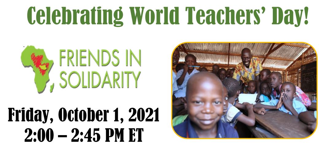 As we anticipate World Teachers’ Day in October, the Board of Directors of Friends in Solidarity invites you to a “Virtual Teachers’ Day Celebration” to salute all teachers, especially the faculty and teachers in training at the Solidarity Teacher Training College in Yambio, South Sudan, and to celebrate the good work that is being accomplished there.