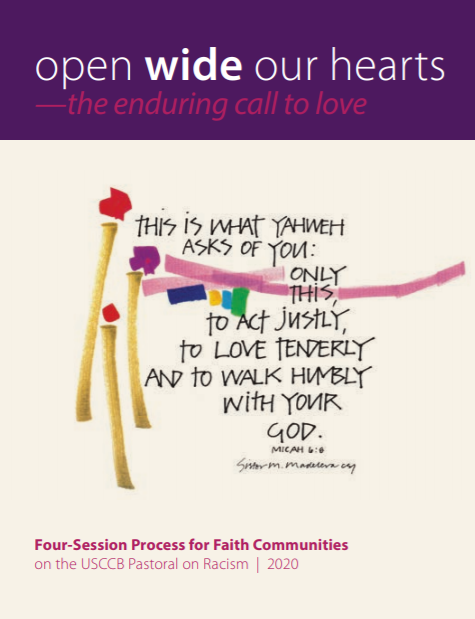 A companion to the United States Conference of Catholic Bishops (USCCB) 2018 pastoral letter on racism, “Open Wide Our Hearts.” The booklet contains prayers, readings and resources to lead and participate in a four-session process. Each session is 90 minutes, which can also be tailored to meet the needs of its users. The resource also contains additional material concerning the history of racism and events/stories/laws that support our understanding of racism.
