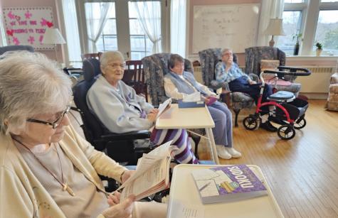 We always try to provide morning prayers for our third-floor sisters as part of a holistic approach to their care. Recently we have been assisted by Sister Mary Jeanne Davidson, SSND, who comes to the lounge every morning to lead a handful of Sisters in prayer.