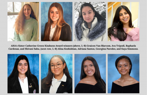 AHA students Hailey Filera, Hannah Kim, Gianna Rodriguez, and Kristina Migliaccio have received the Sister Catherine Green Kindness Award. This award provides recognition for each recipient and recalls S. Catherine, a School Sister of Notre Dame who taught religious studies at AHA from 1982 to 2014.